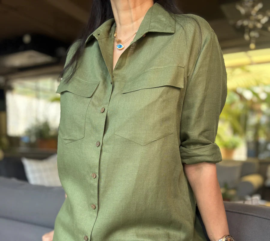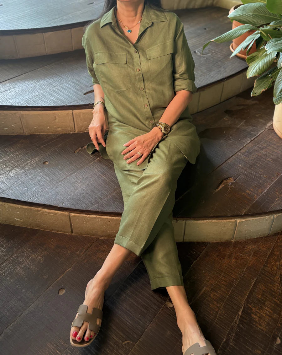 Designed in airy linen, this chic Co-Ord set includes a matching long shirt with a front buttons, styled with sleek narrow trousers.