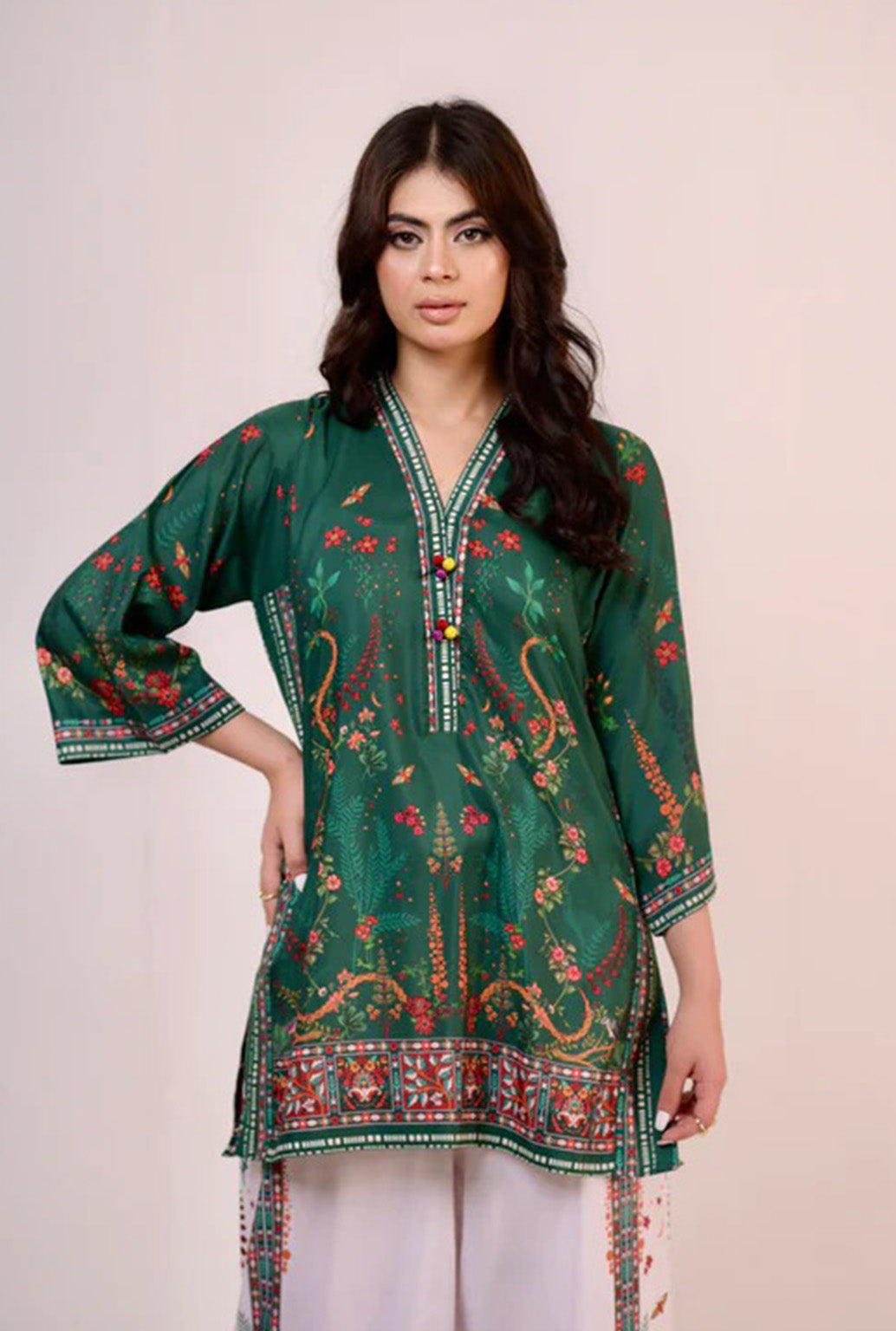A straight V-neckline embellished with contrasting buttons, sleeves falling below the elbows.