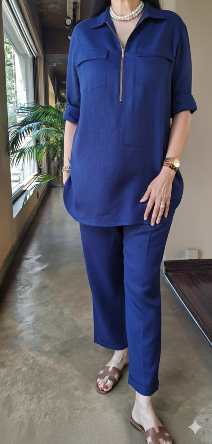 Designed in airy linen, this chic Co-Ord set includes a matching long shirt with a front zip, styled with sleek narrow trousers.